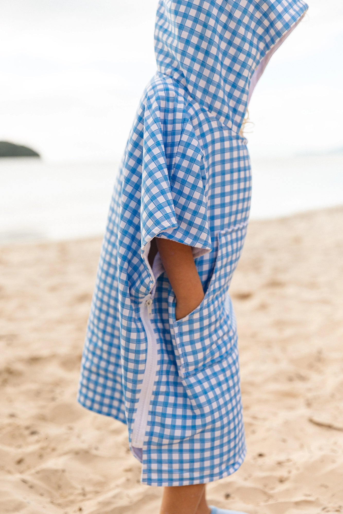 Nosso Roupão Atoalhado é perfeito para as crianças saírem do banho, piscina ou mar quentinhos. É uma peça delicada, confortável e super prática, possui touca, dois fechos de zipper laterais na cor Azul que facilitam a colocação e um bolso frontal. Forro em tecido de toalha 85% algodão na cor Branca. Feito em nossas estampas Vichy Azul.