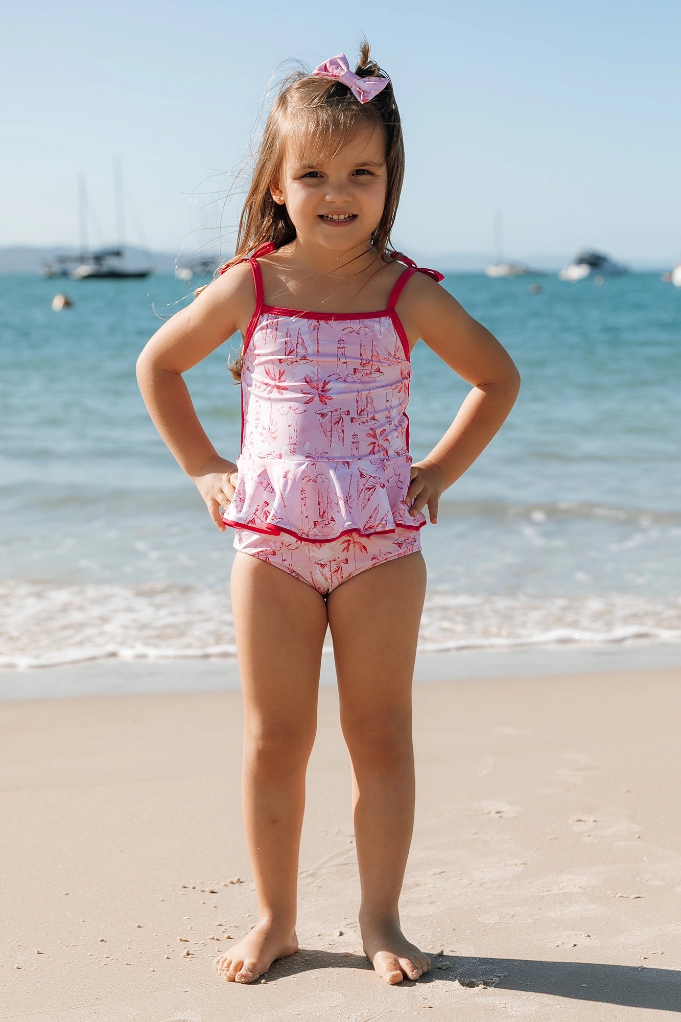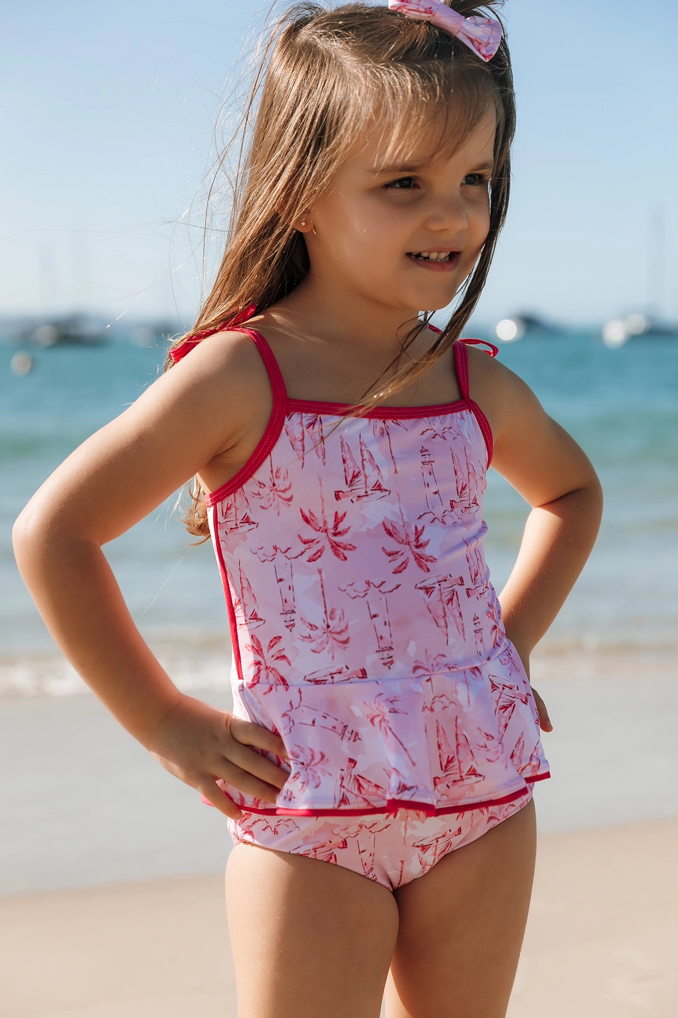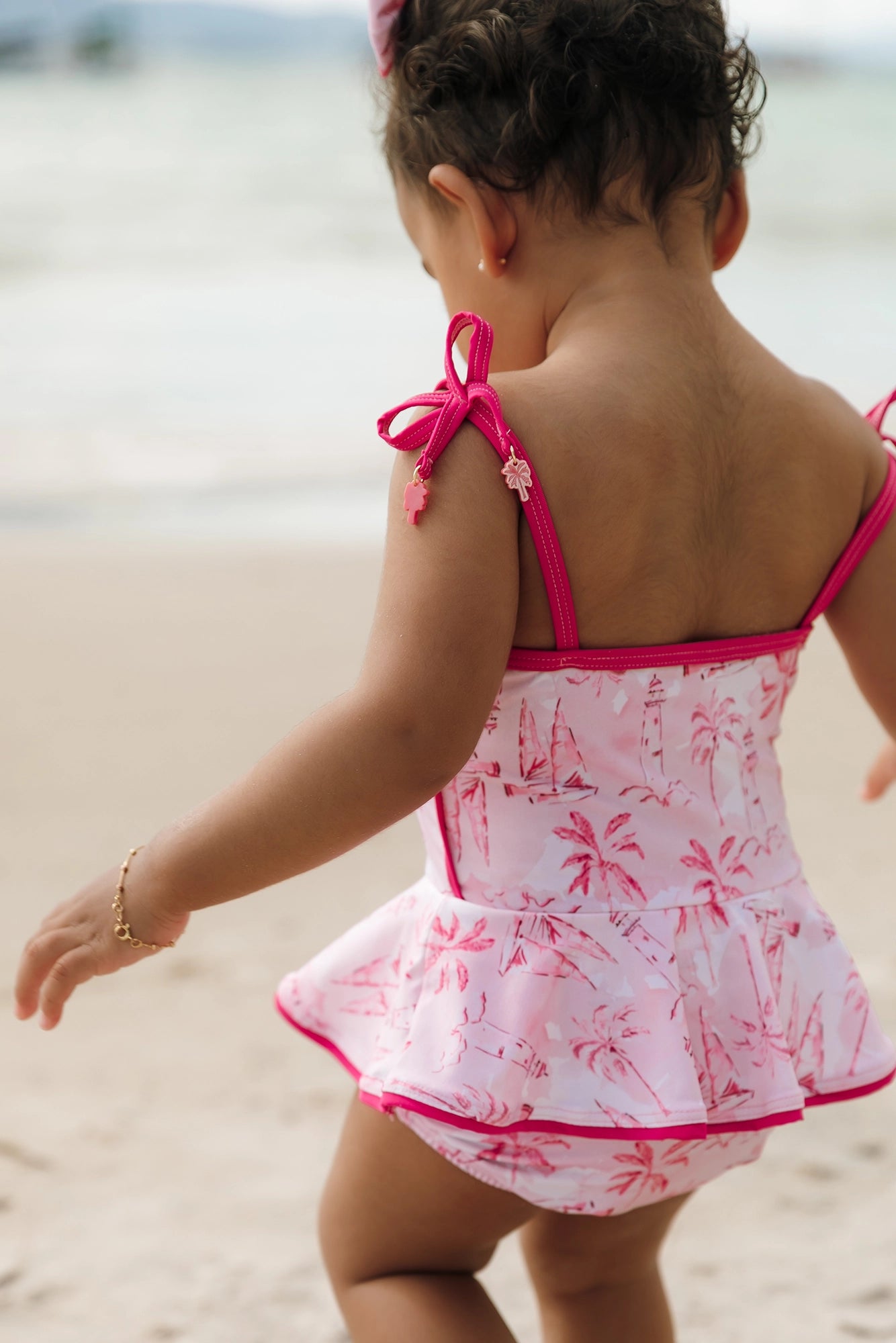 O Maiô Olivia é o nosso maiô infantil feminino Best Seller, para as idades de 6 meses a 8 anos. Possui acabamento elástico, lacinho fixo nas alcinhas, e aplicação de babados que deixam a peça ainda mais especial e delicada. Feito na nossa estampa exclusiva, Veleiros.