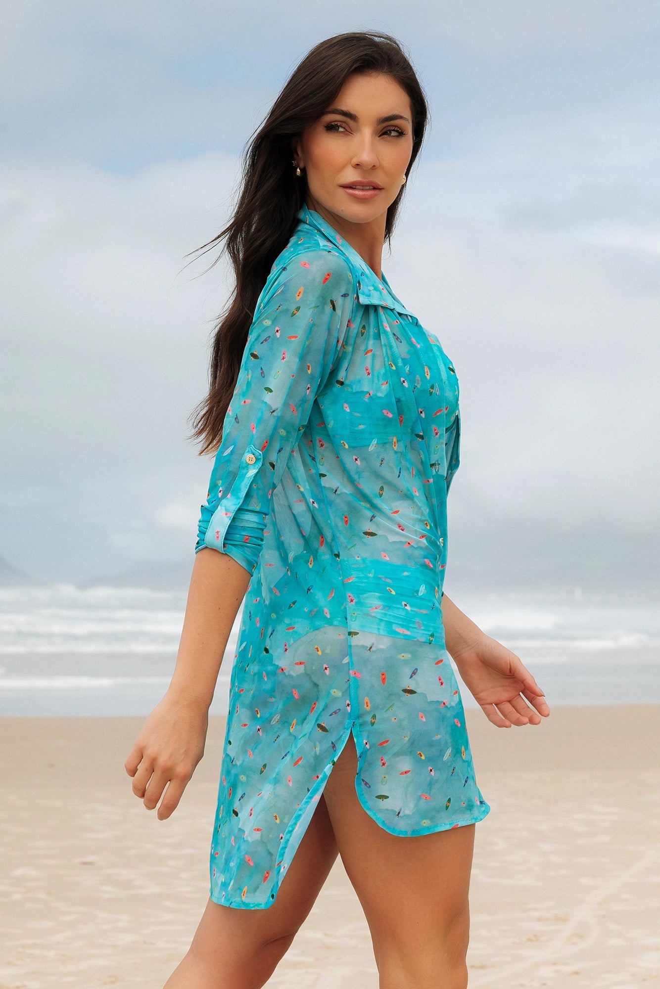 A Chemise Vivi é uma Saída de Praia prática, elegante, e super confortável. Tem mangas compridas, e comprimento médio, com comprimento maior atrás. Feita de tule, um tecido leve, fresquinho e que não amassa. Esta saída possuí botões dourados personalizados, pode ser usada aberta, ou fechada. Feito na nossa estampa exclusiva, Mar.