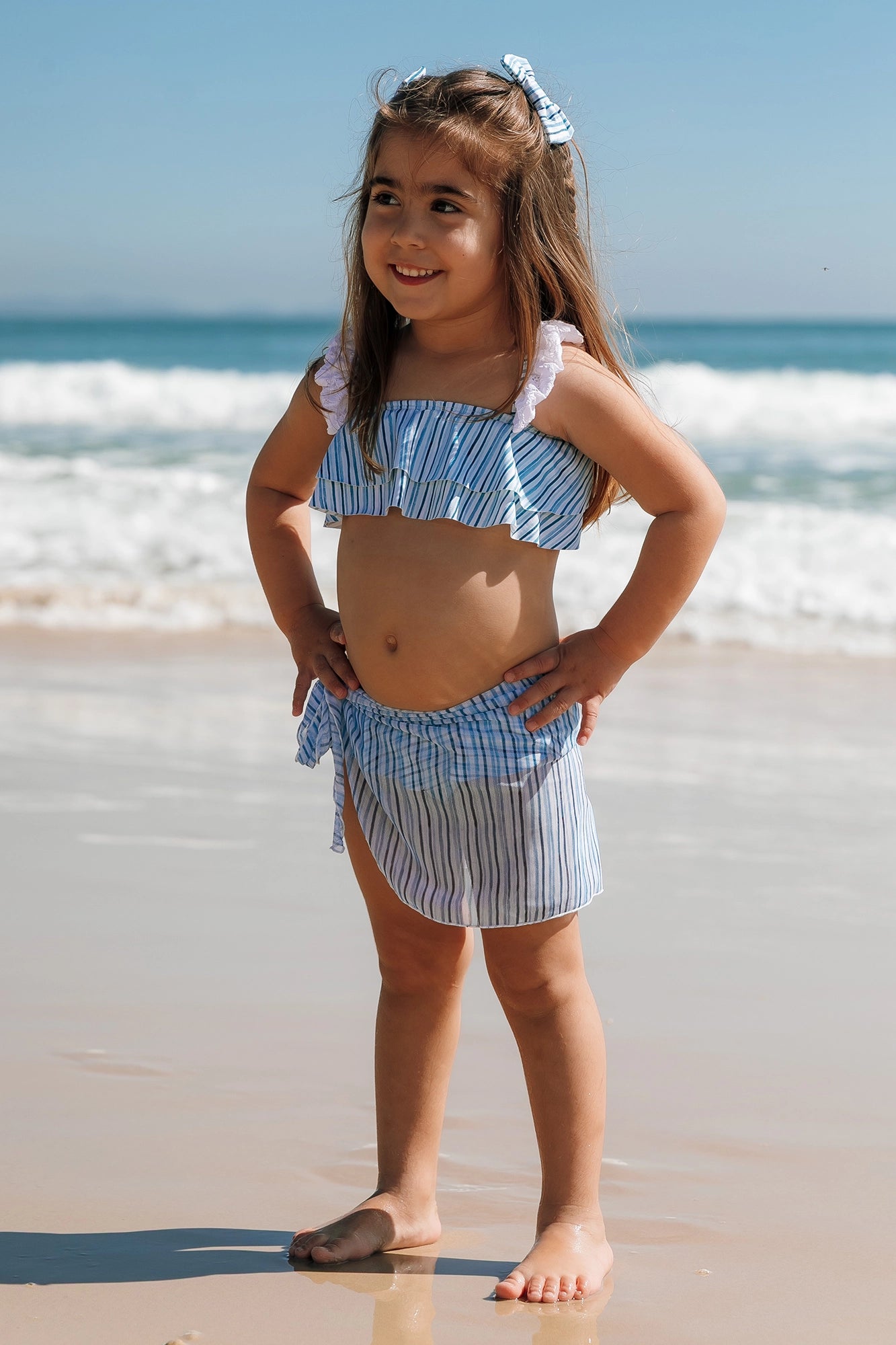 O Pareô Infantil é uma saída de praia super charmosa, que combina com o look de praia adulto. Feito em tecido tule, super levinho e prático. É um modelo que você mesma amarra com nó ou lacinho na lateral, para que fique perfeito na sua filha. Confeccionada na nossa estampa exclusiva, Listras Azul Claro, com Look Tal Mãe Tal Filha.