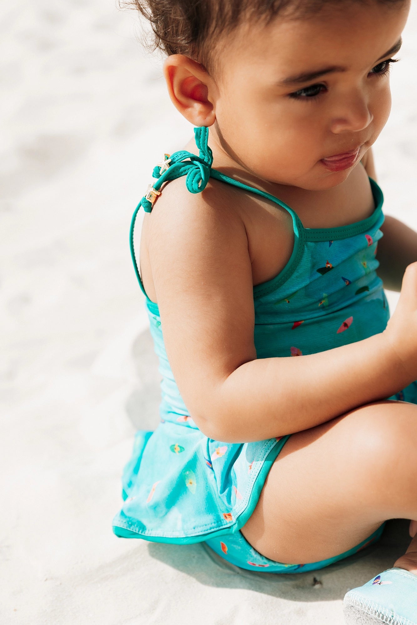 O Maiô Olivia é o nosso maiô infantil feminino Best Seller, para as idades de 6 meses a 8 anos. Possui acabamento elástico, lacinho fixo nas alcinhas, com aviamento de estrela do mar nas pontas e aplicação de babados, que deixam a peça ainda mais especial e delicada. Feito na nossa estampa exclusiva, Mar.