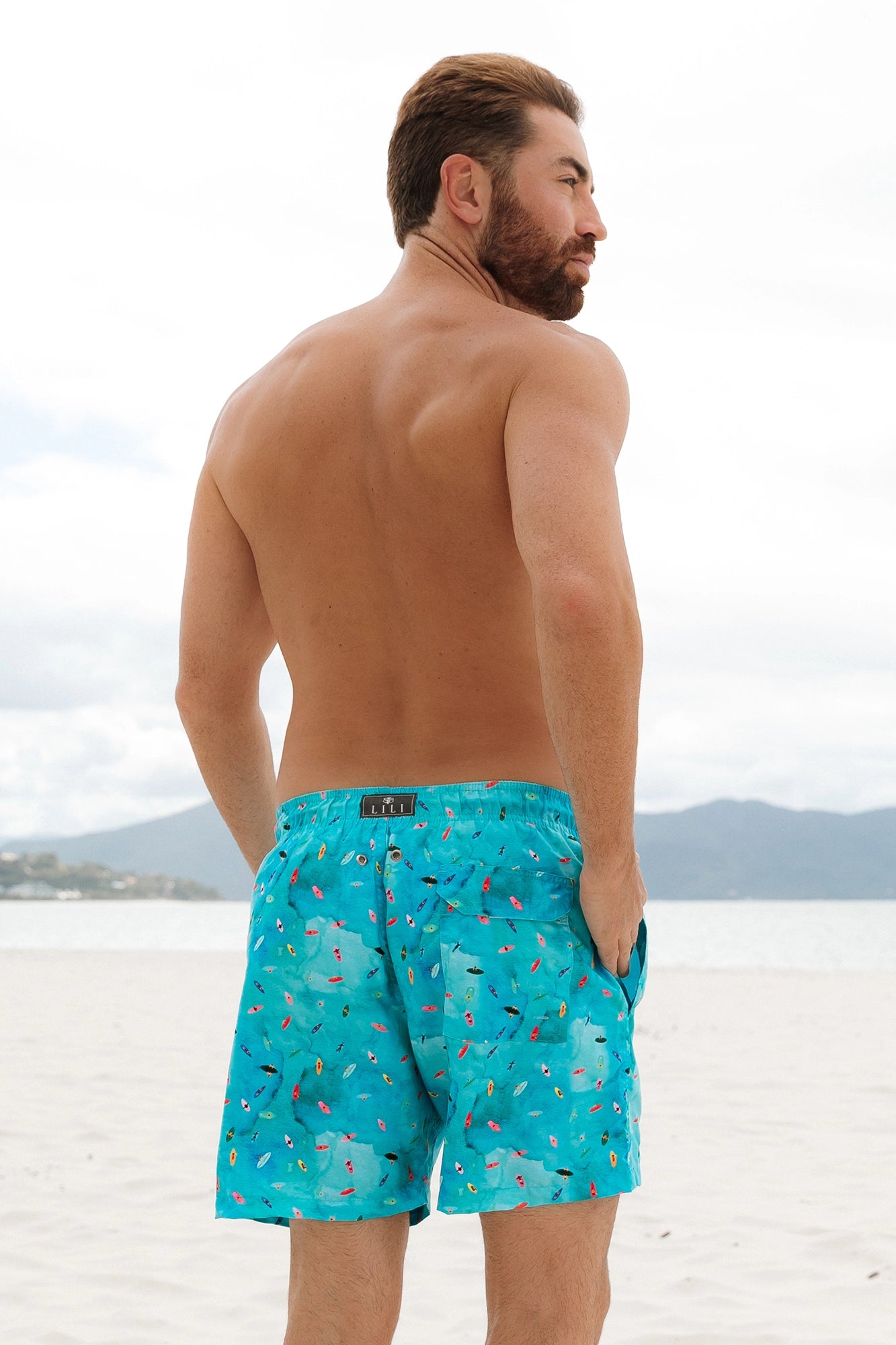 O Short Masculino é um modelo clássico de praia, tem cós de elástico ajustável por cordão, bolsos frontais, bolso posterior com fechamento por velcro. Feito na estampa exclusiva, Mar, combinando para toda a família.