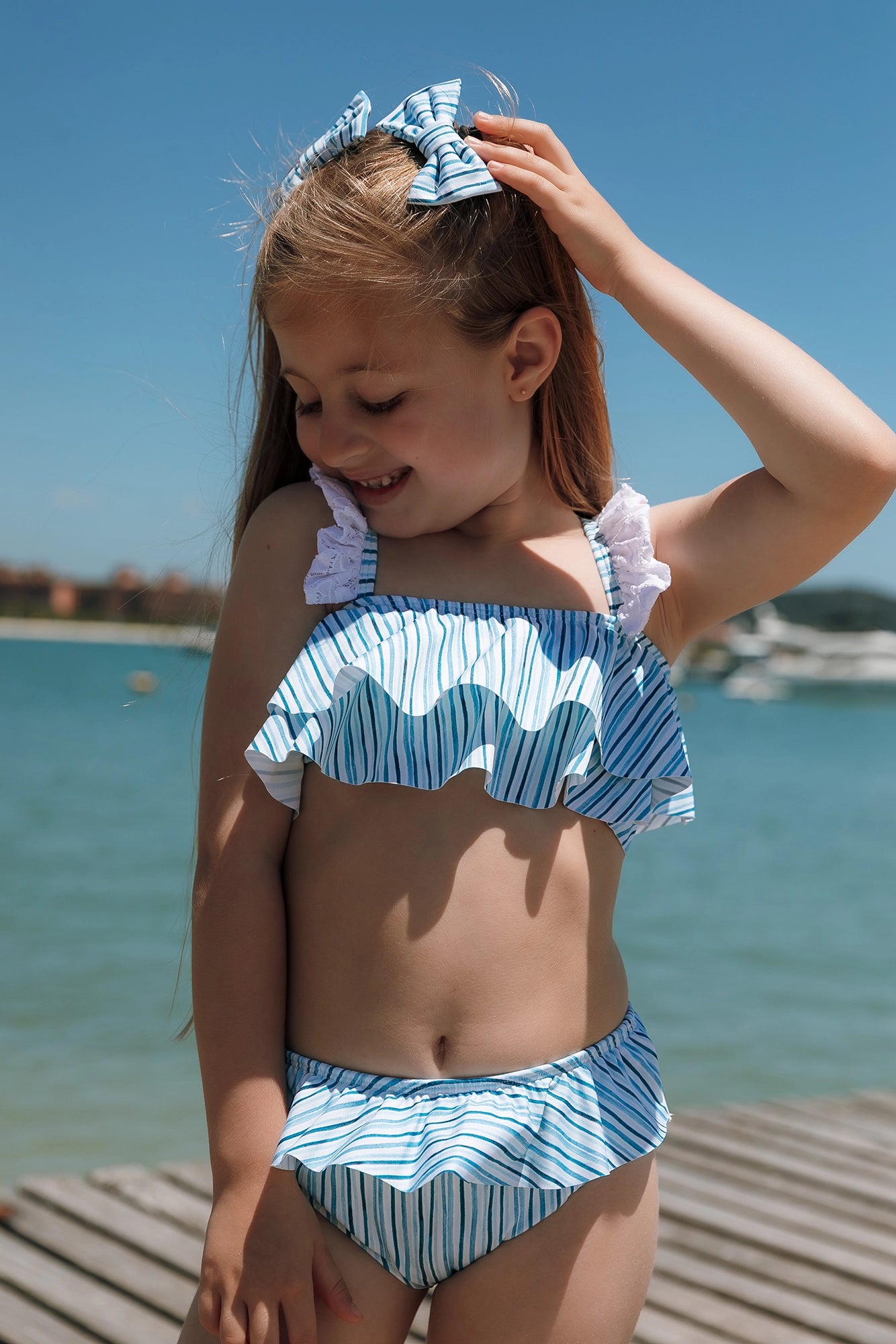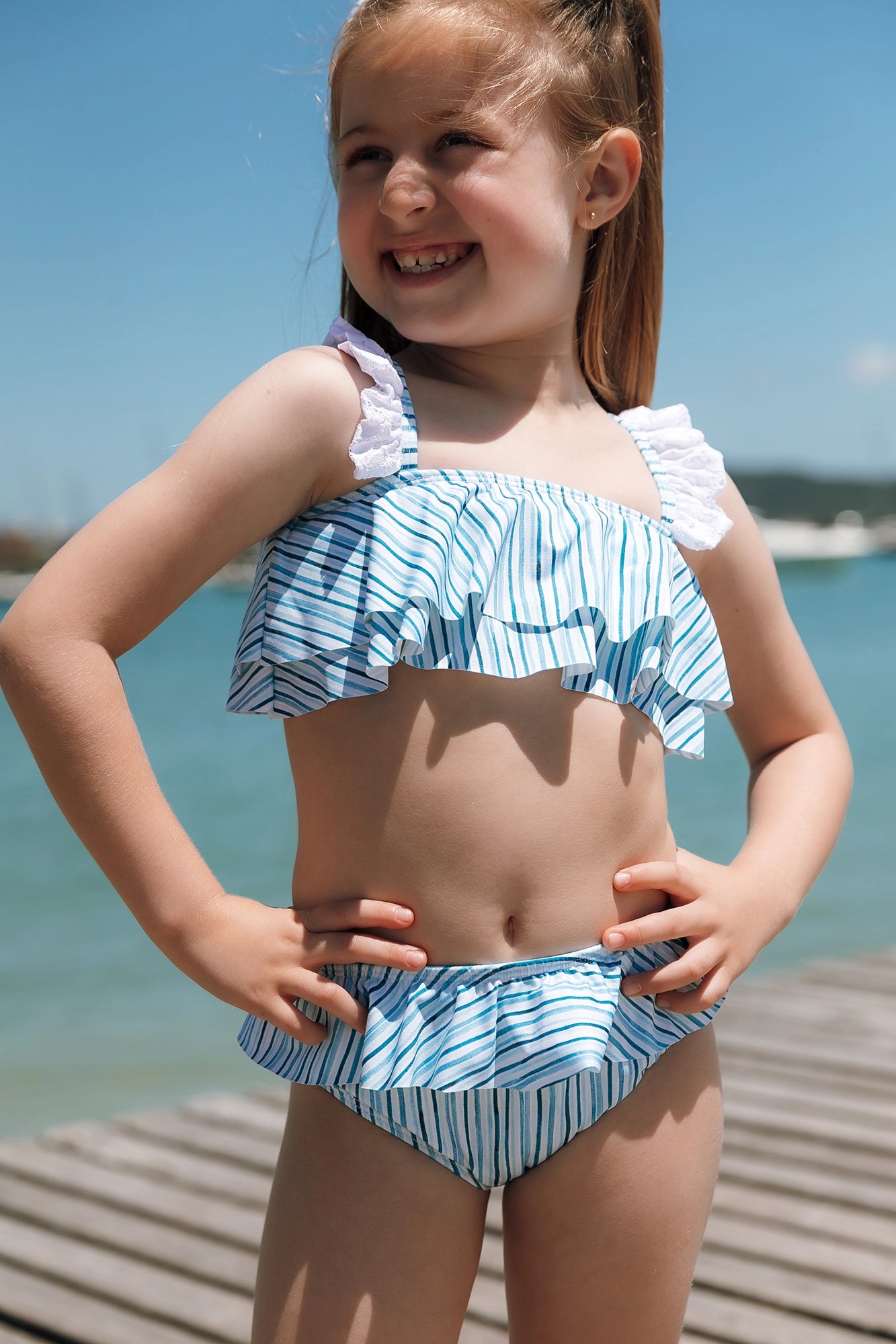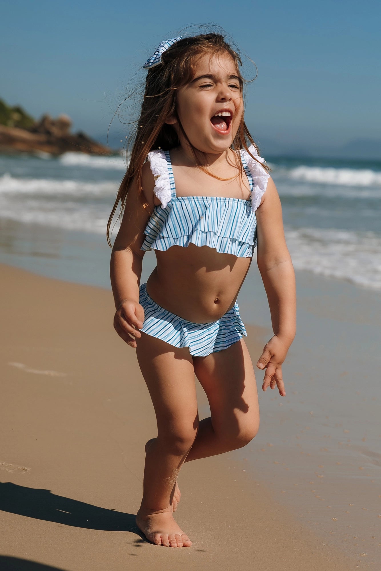 A primeira modelo tem 3 anos de idade e está vestindo tamanho 2 ANOS. A segunda modelo tem 6 anos de idade e está vestindo tamanho 6 ANOS.